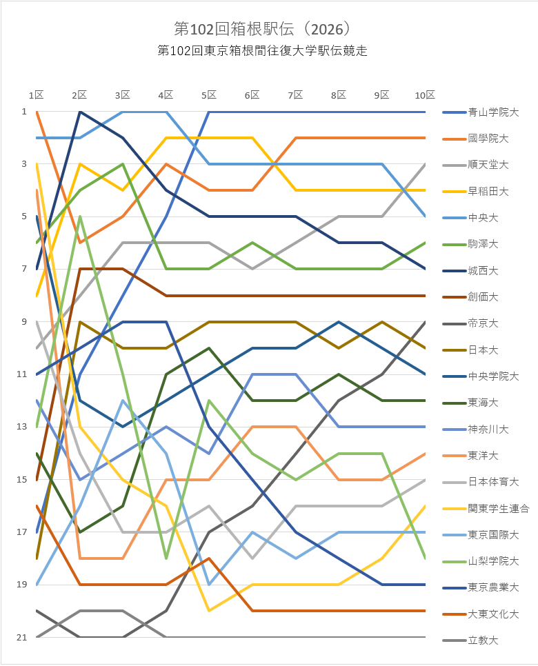 | 1 | 青山学院大 | 10:37:34 | 折田 壮太 | 2 | 1:07:59 | 2 | 1→1 | →0 |