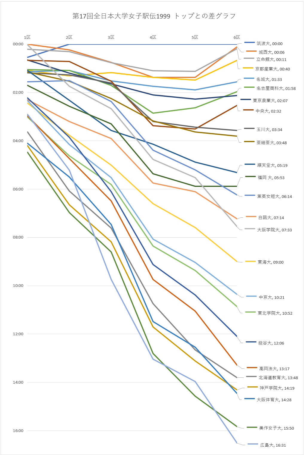 | 7 | 東京農業大 | 00:39 | 01:12 | 01:38 | 02:06 | 02:16 | 02:07 |