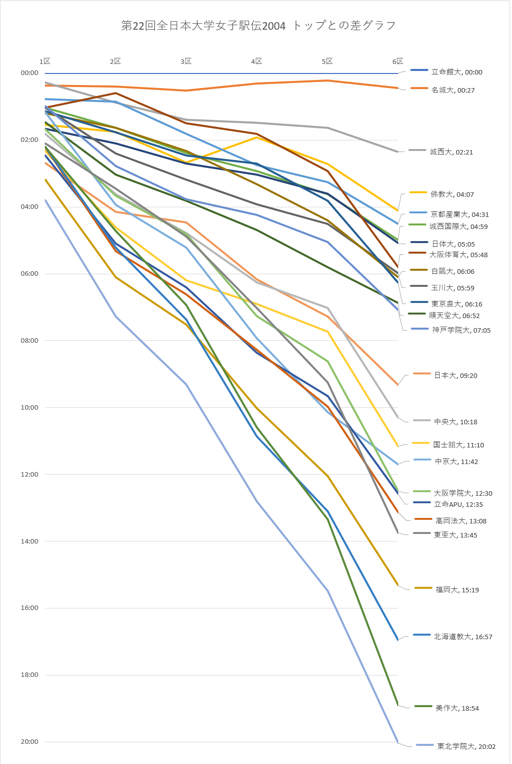 | 6 | 城西国際大 | 01:02 | 01:38 | 02:23 | 02:56 | 03:37 | 04:59 |
