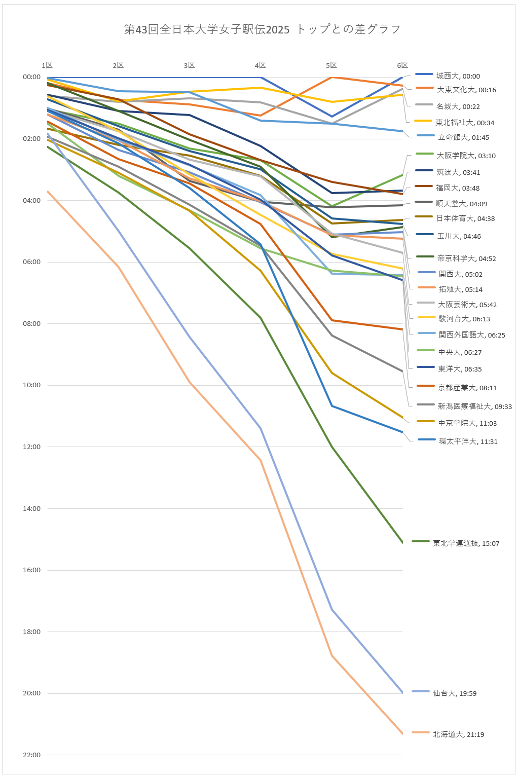 | 6 | 大阪学院大 | 01:03 | 01:30 | 02:19 | 02:41 | 04:11 | 03:10 |