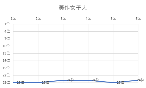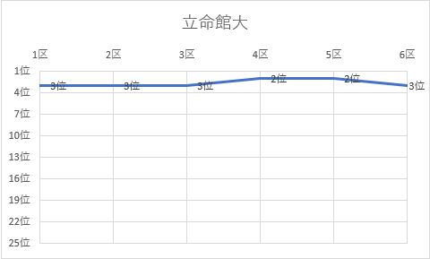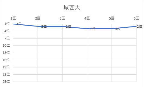1位 筑波大 2位 城西大 3位 立命館大 4位 京都産業大 5位 名城大 6位 名古屋商科大 7位 東京農業大 8位 中央大 9位 玉川大 10位 亜細亜大 11位 順天堂大 12位 福岡 大 13位 薫英女短大 14位 白鷗大 15位 大阪学院大 16位 東海大 17位 中京大 18位 東北学院大 19位 龍谷大 20位 高岡法大 21位 北海道教育大 22位 神戸学院大 23位 大阪体育大 24位 美作女子大 25位 広島大