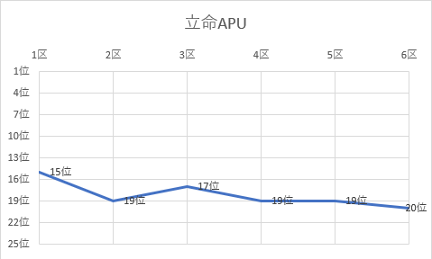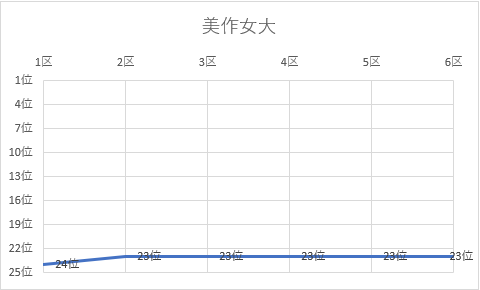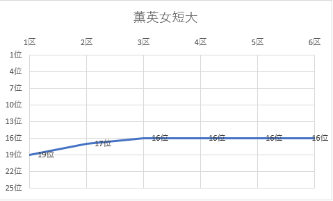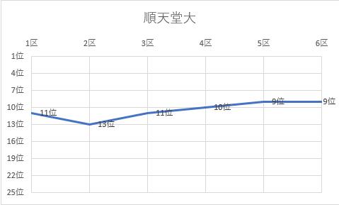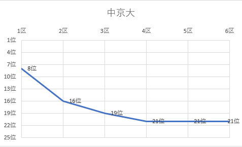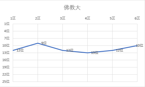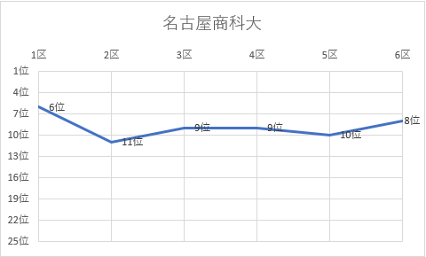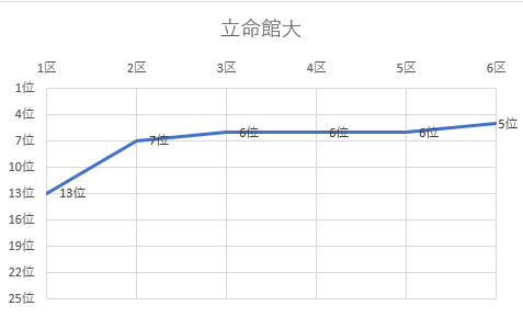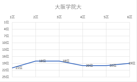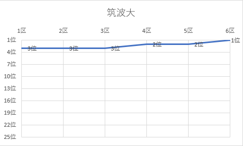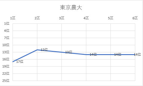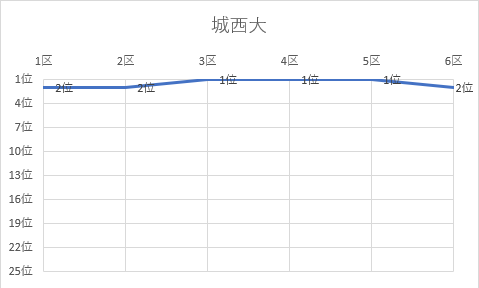 1位 筑波大 2位 城西大 3位 玉川大 4位 名城大 5位 立命館大 6位 京都産業大 7位 中央大 8位 名古屋商科大 9位 順天堂大 10位 佛教大 11位 白鷗大 12位 福岡大 13位 神戸学院大 14位 東京農大 15位 高岡法大 16位 薫英女短大 17位 日体大 18位 東海大 19位 大阪学院大 20位 立命APU 21位 中京大 22位 大阪体育大 23位 美作女大 24位 東北学大 25位 札学院大