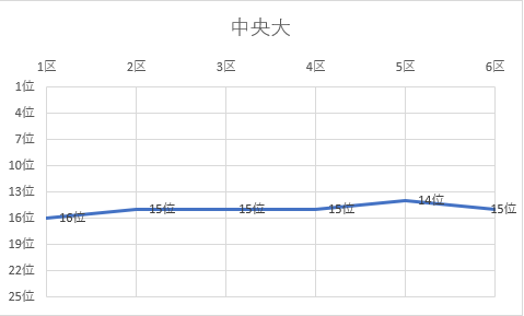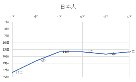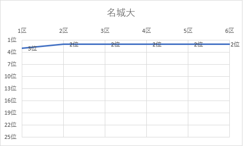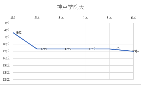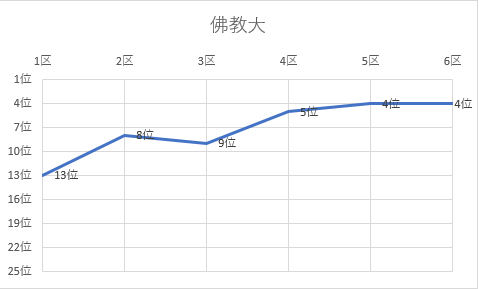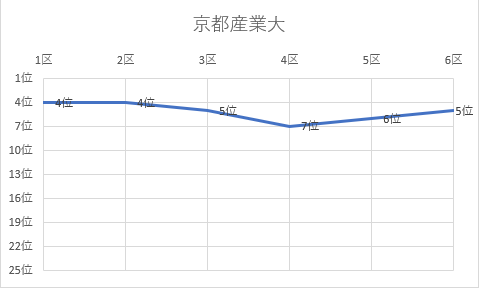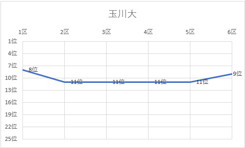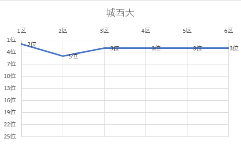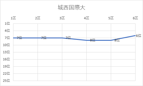 1位 立命館大 2位 名城大 3位 城西大 4位 佛教大 5位 京都産業大 6位 城西国際大 7位 日本体育大 8位 大阪体育大 9位 玉川大 10位 白鷗大 11位 東京農大 12位 順天堂大 13位 神戸学院大 14位 日本大 15位 中央大 16位 国士舘大 17位 中京大 18位 大阪学院大 19位 立命APU 20位 高岡法大 21位 東亜大 22位 福岡大 23位 北海道教大 24位 美作大 25位 東北学院大