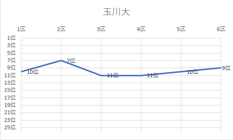 | 3区 | 9.1㎞ | 0:29:19 | 小島 一恵 | 4年 | 1位 | 1:10:02 | 2位 |