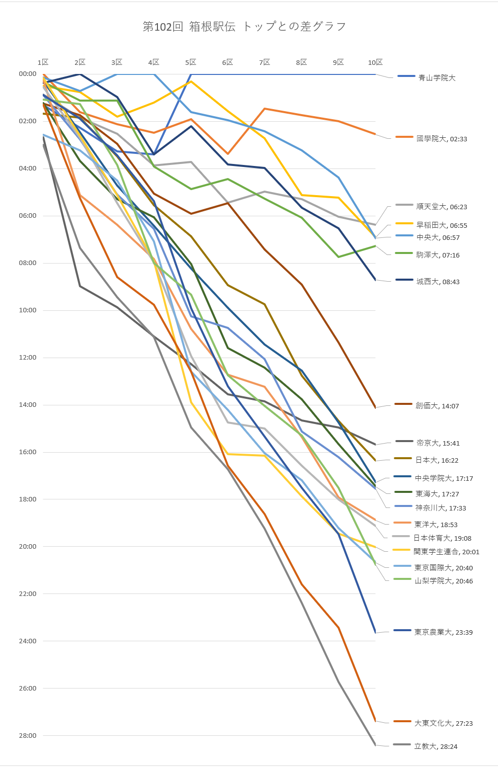 | 創価大 | 01:15 | 01:44 | 02:57 | 05:04 | 05:55 | 05:28 | 07:25 | 08:54 | 0:11:22 | 0:14:07 |
