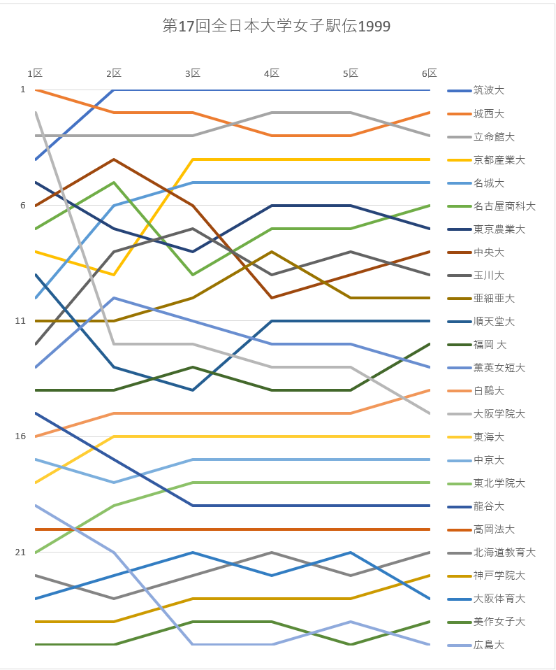 | 順位 | 大学 | 1区 | 2区 | 3区 | 4区 | 5区 | 6区 |