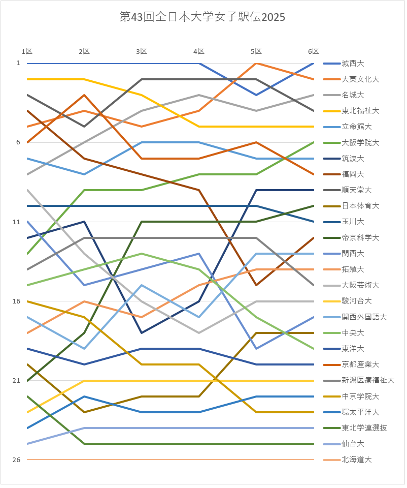 | 順位 | 大学 | 1区 | 2区 | 3区 | 4区 | 5区 | 6区 |