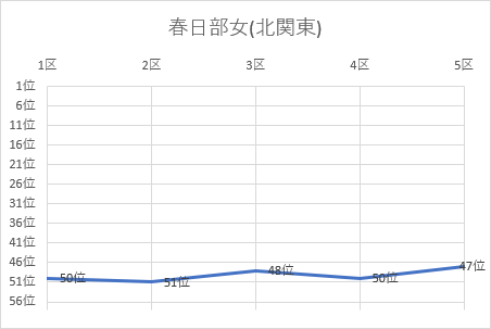 | 4区 | 3.0㎞ | 0:10:29 | 若松 来実 | 3 | 51位 | 0:56:52 | 52位 |
