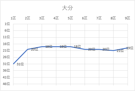 1位 千葉 2位 茨城 3位 鹿児島 4位 神奈川 5位 東京 6位 京都 7位 兵庫 8位 大阪 9位 宮城 10位 群馬 11位 山口 12位 静岡 13位 宮崎 14位 富山 15位 愛知 16位 熊本 17位 新潟 18位 福島 19位 大分 20位 三重 21位 福岡 22位 愛媛 23位 鳥取 24位 和歌山 25位 青森 26位 長野 27位 石川 28位 北海道 29位 奈良 30位 長崎 31位 岡山 32位 栃木 33位 佐賀 34位 埼玉 35位 山梨 36位 滋賀 37位 岐阜 38位 秋田 39位 広島 40位 島根 41位 山形 42位 香川 43位 福井 44位 徳島 45位 沖縄 46位 高知 47位 岩手