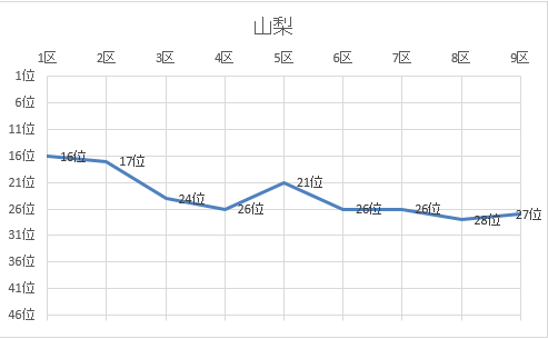 1位 愛知 2位 京都 3位 大阪 4位 兵庫 5位 千葉 6位 長野 7位 神奈川 8位 静岡 9位 東京 10位 岡山 11位 長崎 12位 福岡 13位 群馬 14位 鹿児島 15位 広島 16位 宮城 17位 大分 18位 埼玉 19位 山形 20位 愛媛 21位 宮崎 22位 茨城 23位 和歌山 24位 北海道 25位 熊本 26位 秋田 27位 山梨 28位 高知 29位 佐賀 30位 石川 31位 富山 32位 福島 33位 三重 34位 山口 35位 滋賀 36位 岩手 37位 新潟 38位 岐阜 39位 奈良 40位 栃木 41位 福井 42位 徳島 43位 香川 44位 鳥取 45位 青森 46位 沖縄 47位 島根